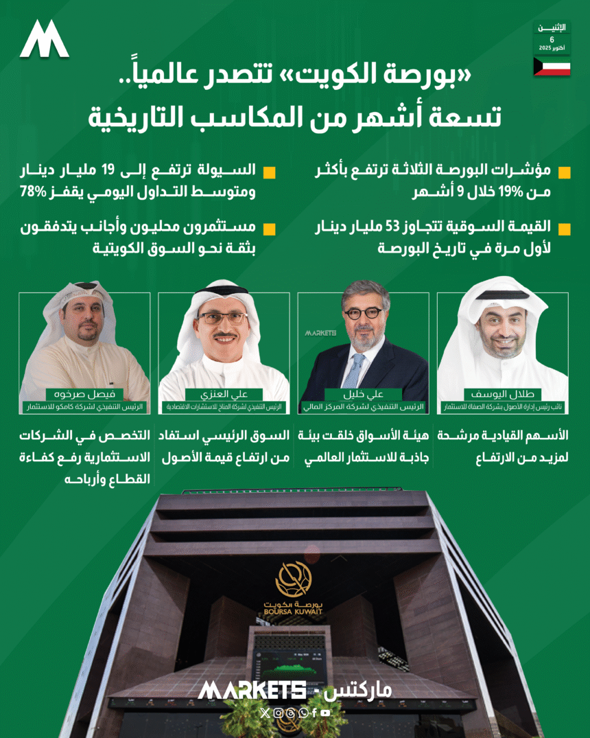 نهاية شهر سبتمبر، تكمل بورصة الكويت تسعة أشهر من أداء استثنائي وضعها على قائمة أكثر البورصات مكاسباً ونمواً في العالم. فبنهاية الربع الثالث، تكون جميع المؤشرات الرئيسية قد سجلت نموًا صعدت فيه المؤشرات الثلاثة: الأول والرئيسي والعام بأكثر من 19%، صعودٌ رفع القيمة السوقية الرأسمالية لأول مرة في تاريخها إلى أكثر من 53 مليار دينار، قبل أن تتراجع دونها بقليل مع ختام الربع الثالث، وفقاً لـ «CNBC عربية».