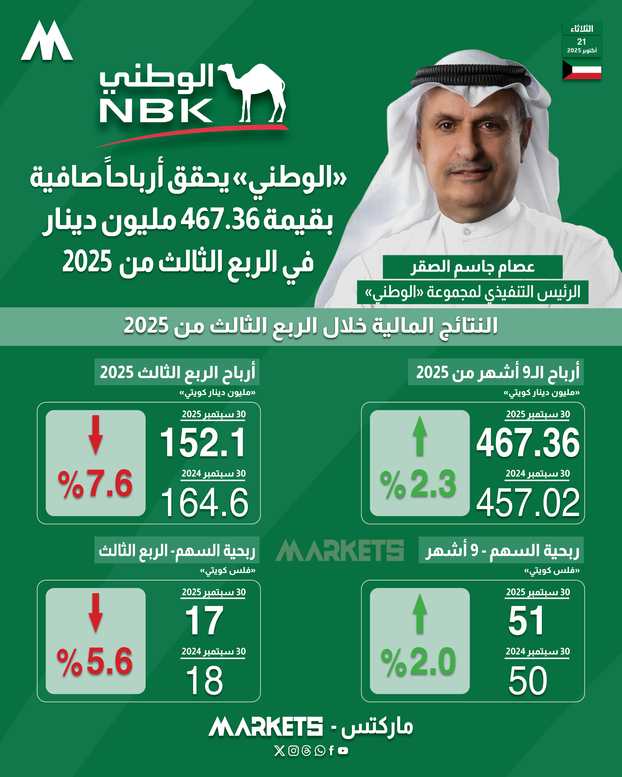 وحقق «الوطني» أرباحاً بلغت قيمتها 467.36 مليون دينار خلال الأشهر التسعة الأولى من العام 2025 ، مقارنة بأرباح قدرها 457.02 مليون دينار في الفترة المماثلة من العام 2024 ، بنمو سنوي نسبته 2.3%.