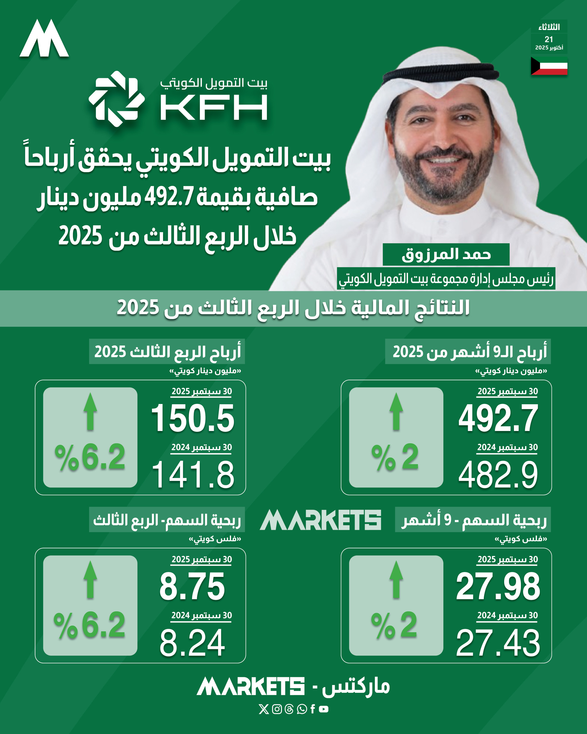 وربح بيت التمويل الكويتي 150.5 مليون دينار خلال الثلاثة أشهر المنتهية في 30 سبتمبر 2025 ، مقابل 141.8 مليون دينار خلال الربع الثالث من عام 2024 ، بنمو نسبته 6.2% على أساس سنوي وبواقع 8.75 فلس للسهم .