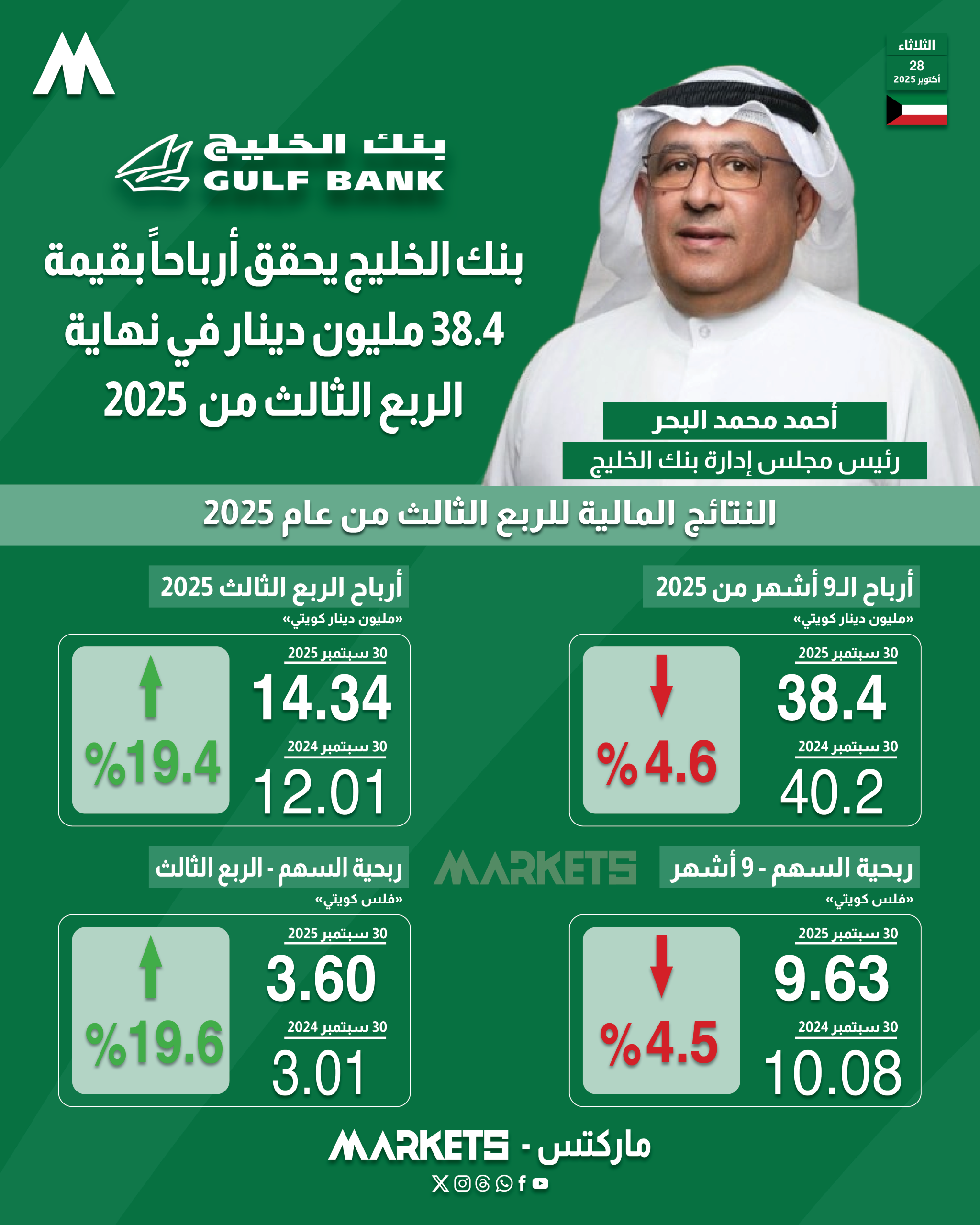 وخلال الربع الثالث من عام 2025 ، ارتفعت أرباح بنك الخليج بنسبة 19.4% على أساس سنوي إلى 14.34 مليون دينار ، مقابل 12.01 مليون دينار خلال الربع الثالث من عام 2024 ، وبربح قدره 3.60 فلس للسهم .