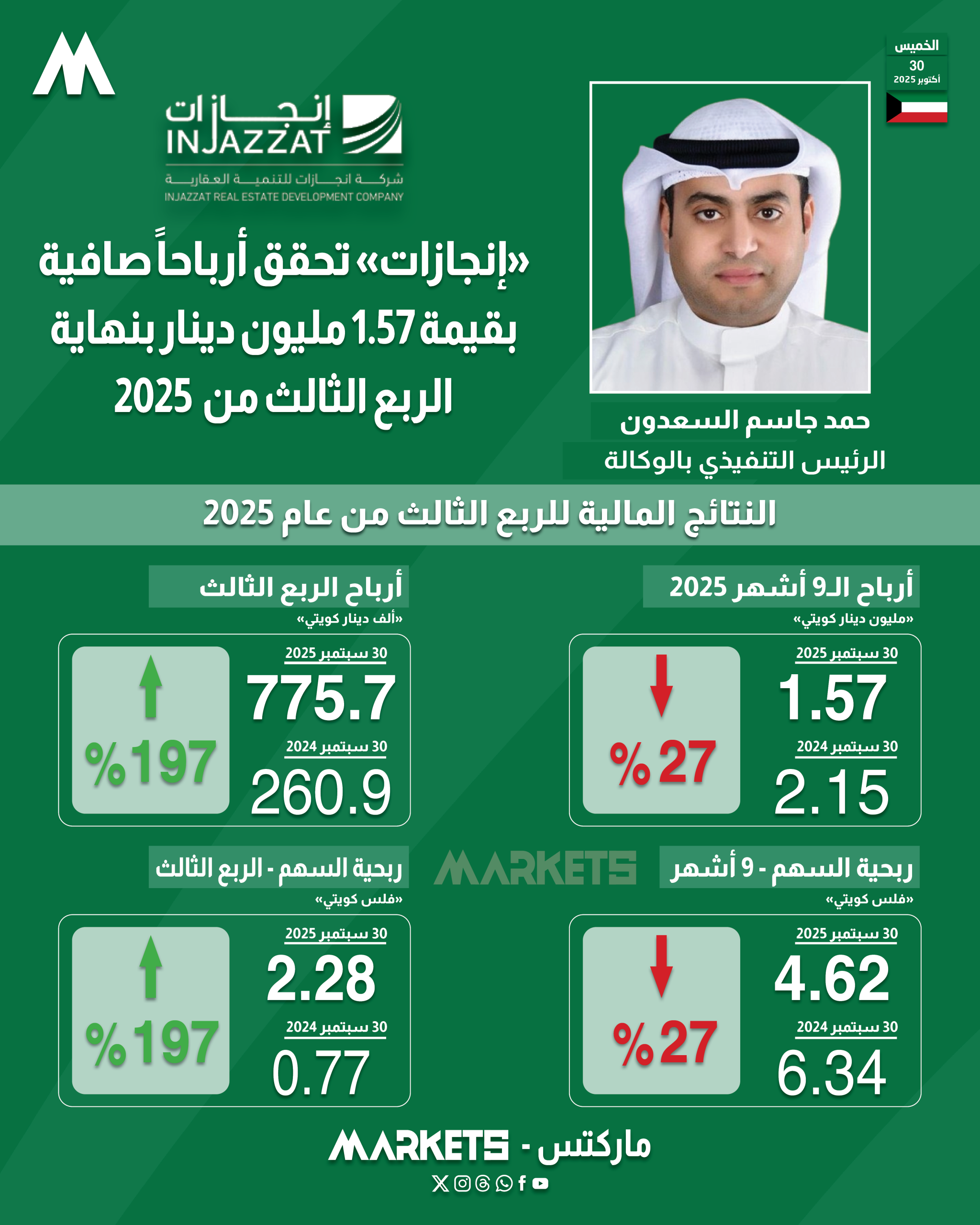 وزادت أرباح «إنجازات» في الربع الثالث من عام 2025 بنسبة 197% لتحقق ربحاً قيمته 775.7 ألف دينار في الثلاثة أشهر المنتهية في 30 سبتمبر 2025 ، مقابل ربح قدره 260.9 ألف دينار في الربع الثالث من عام 2024.