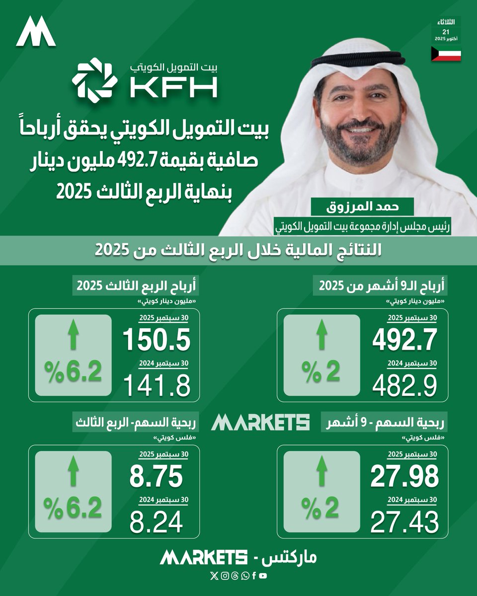 • سهم بيت التمويل الكويتي ربح 27.98 فلس للسهم الواحد مقابل 27.43 في الفترة المماثلة من 2024 بزيادة سنوية 2%