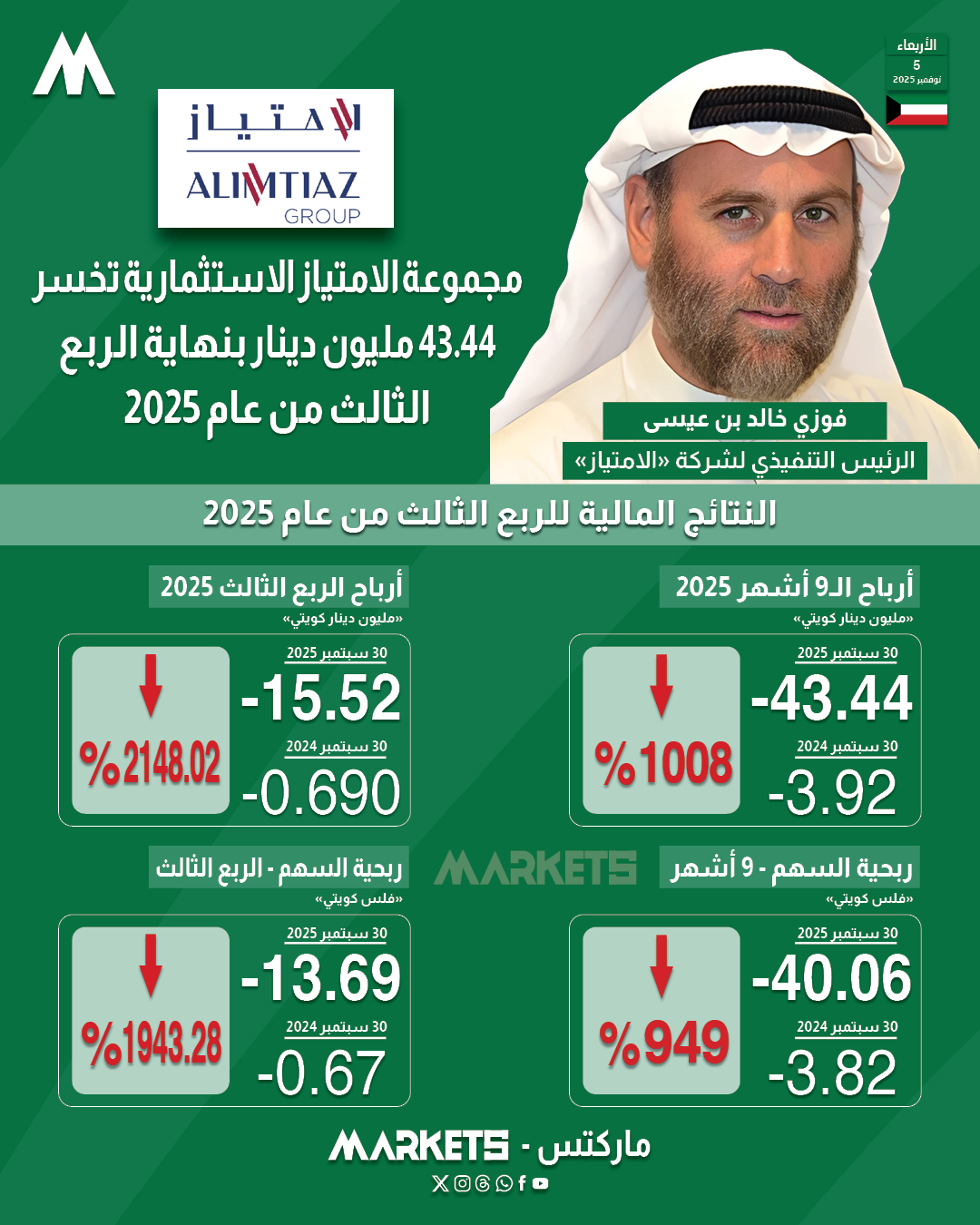 وخلال الربع الثالث من عام 2025 ، ارتفعت خسائر «الامتياز» بنحو 2148.02% على أساس سنوي لتسجل خسار بقيمة 15.52 مليون دينار في الثلاثة أشهر المنتهية في 30 سبتمبر 2025، مقابل 690.47 ألف دينار خسائر في الربع الثالث من عام 2024 .