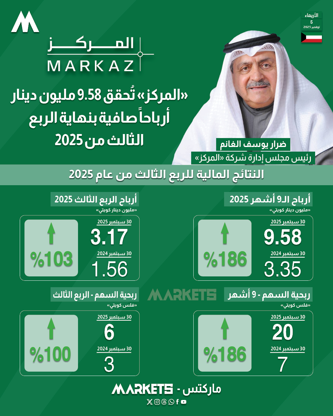 وارتفعت أرباح «المركز» خلال الربع الثالث من عام 2025 بنسبة 103% على أساس سنوي لتسجل 3.17 مليون دينار، مقابل 1.56 مليون دينار خلال الربع الثالث من عام 2024 ، بواقع 6 فلوس للسهم الواحد .