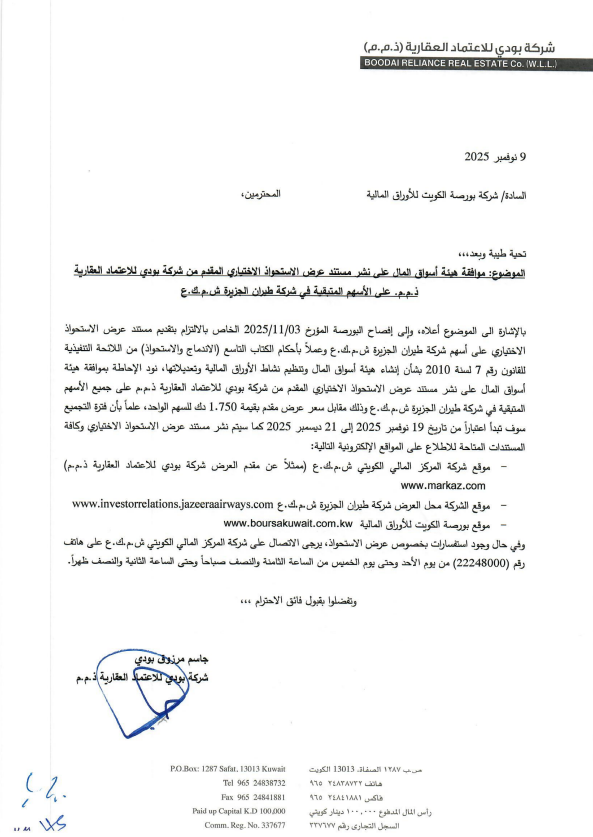 أعلنت شركة بودي للاعتماد العقارية موافقة هيئة أسواق المال على مستند عرض الاستحواذ الاختياري المقدم من الشركة لمساهمي شركة طيران الجزيرة ، وذلك تنفيذاً لأحكام اللائجة التنفيذية للقانون رقم 7 لسنة 2010 بشان إنشاء هيئة أسواق المال ، وتنظيم نشاط الأوراق المالية وتعليمات هيئة أسواق المال بشأن إجراءات عملية الاستحواذ الاختياري .