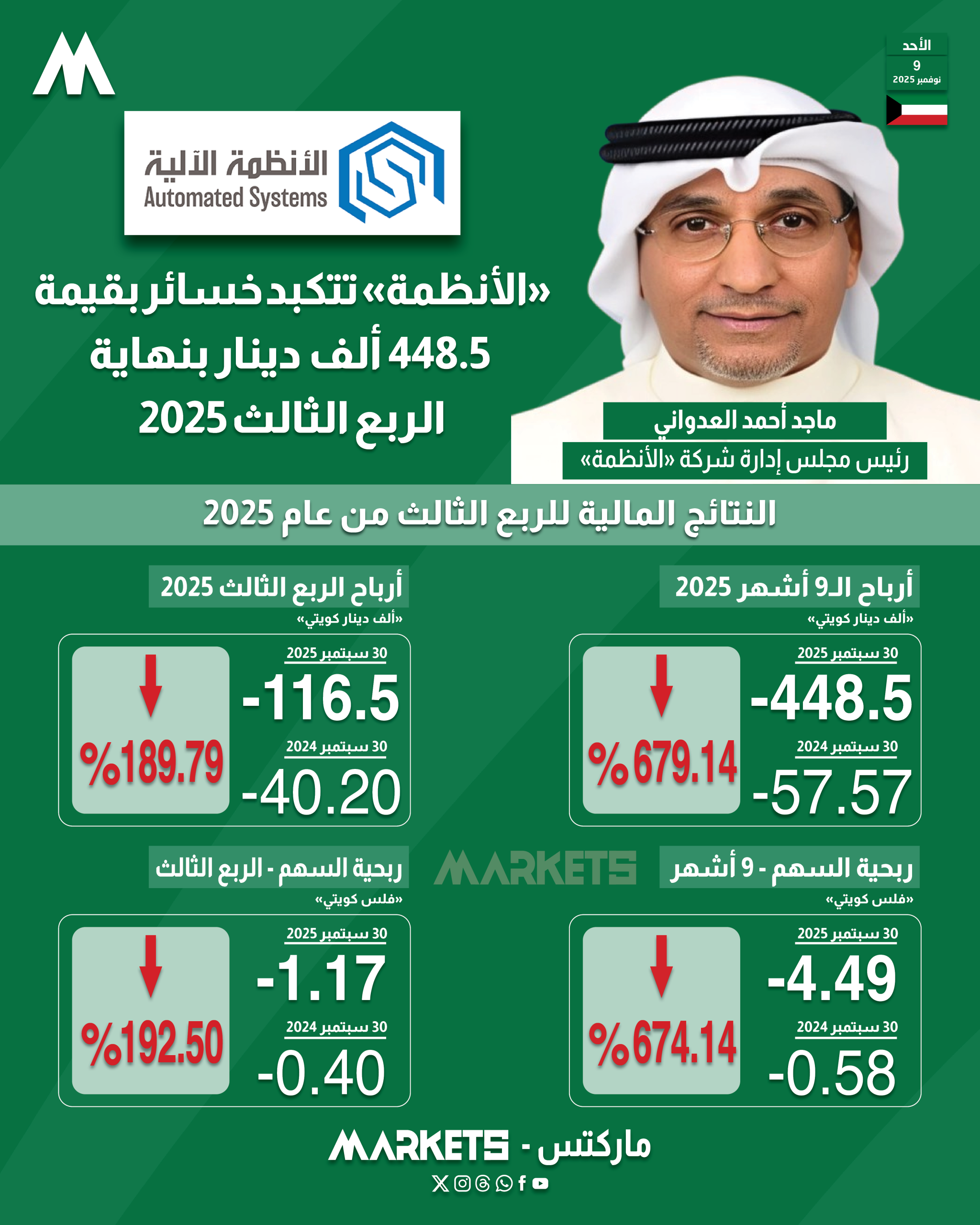 وارتفعت خسائر «الأنظمة» خلال الربع الثالث من عام 2025 بنسبة 189.79%، لتسجل خسائر قيمتها 116.50 ألف دينار ، مقابل 40.20 ألف دينار خسائر الربع الثالث من عام 2024 ، وبواقع 1.17 فلس للسهم الواحد .