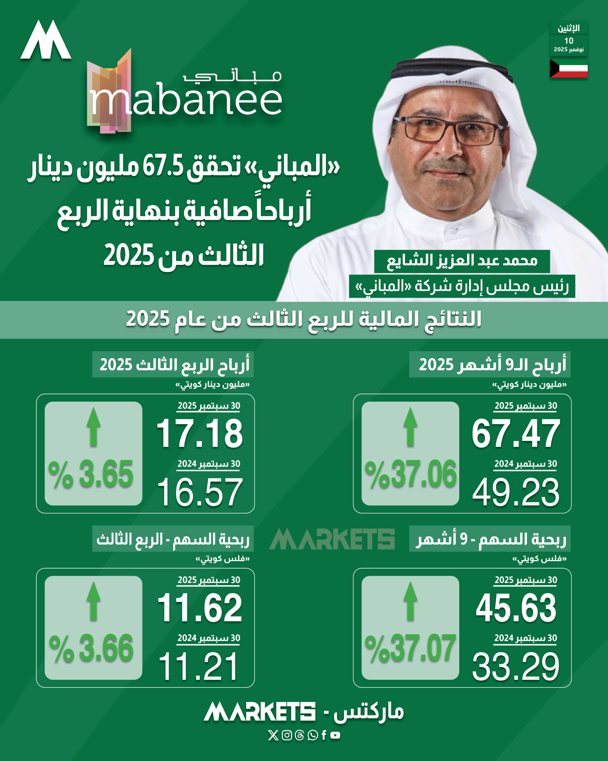 وارتفعت أرباح «المباني» في الربع الثالث من عام 2025 بنسبة 3.65% لتسجل 17.18 مليون دينار، مقابل 16.57 مليون دينار ربح الربع الثالث من عام 2024 ، بواقع 11.62 فلس للسهم .