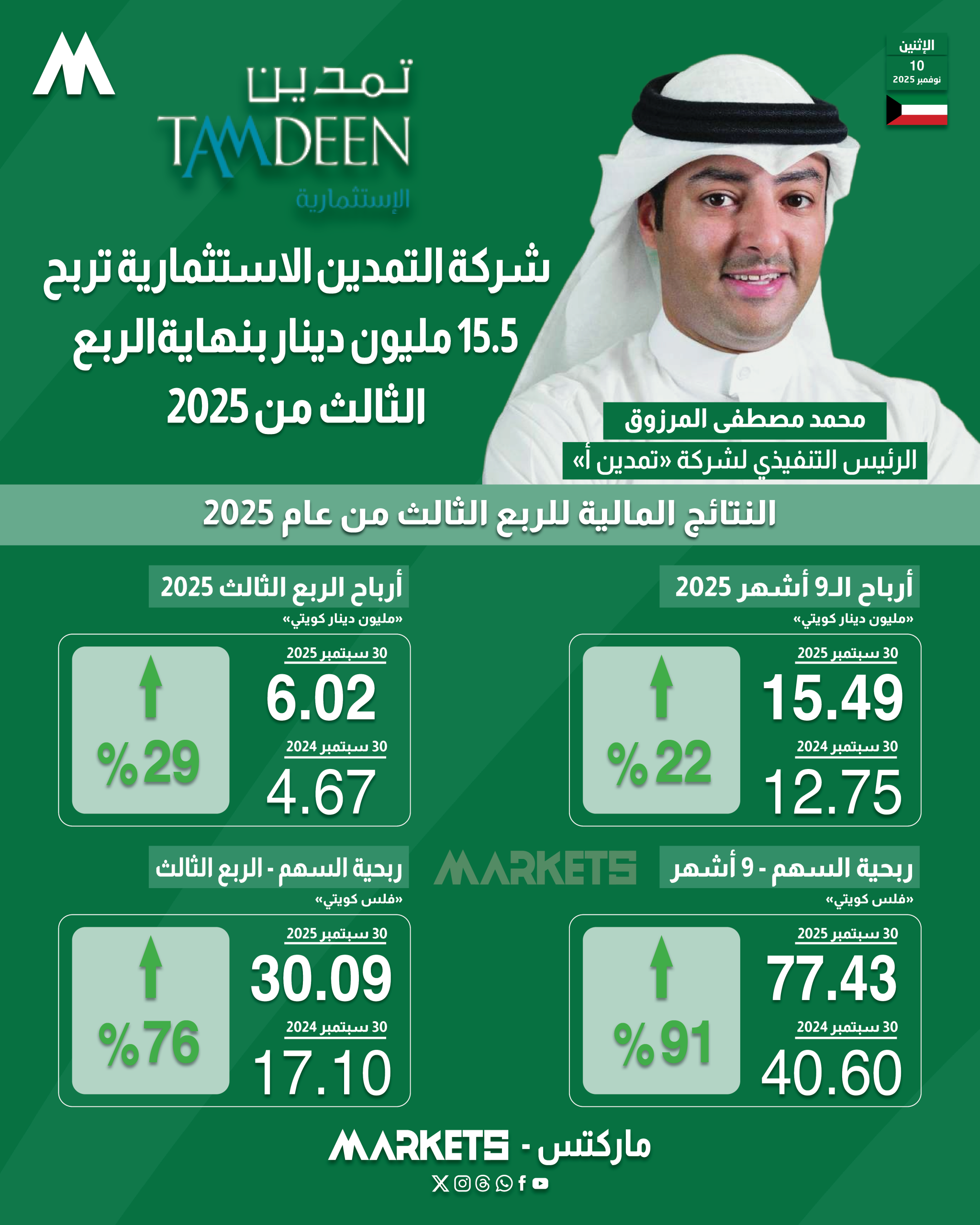 وخلال الربع الثالث من عام 2025 ، ارتفعت أرباح «تمدين أ» بنسبة 29% لتبلغ 6.02 مليون دينار ، مقابل 4.67 مليون دينار ربح الربع الثالث من عام 2024.