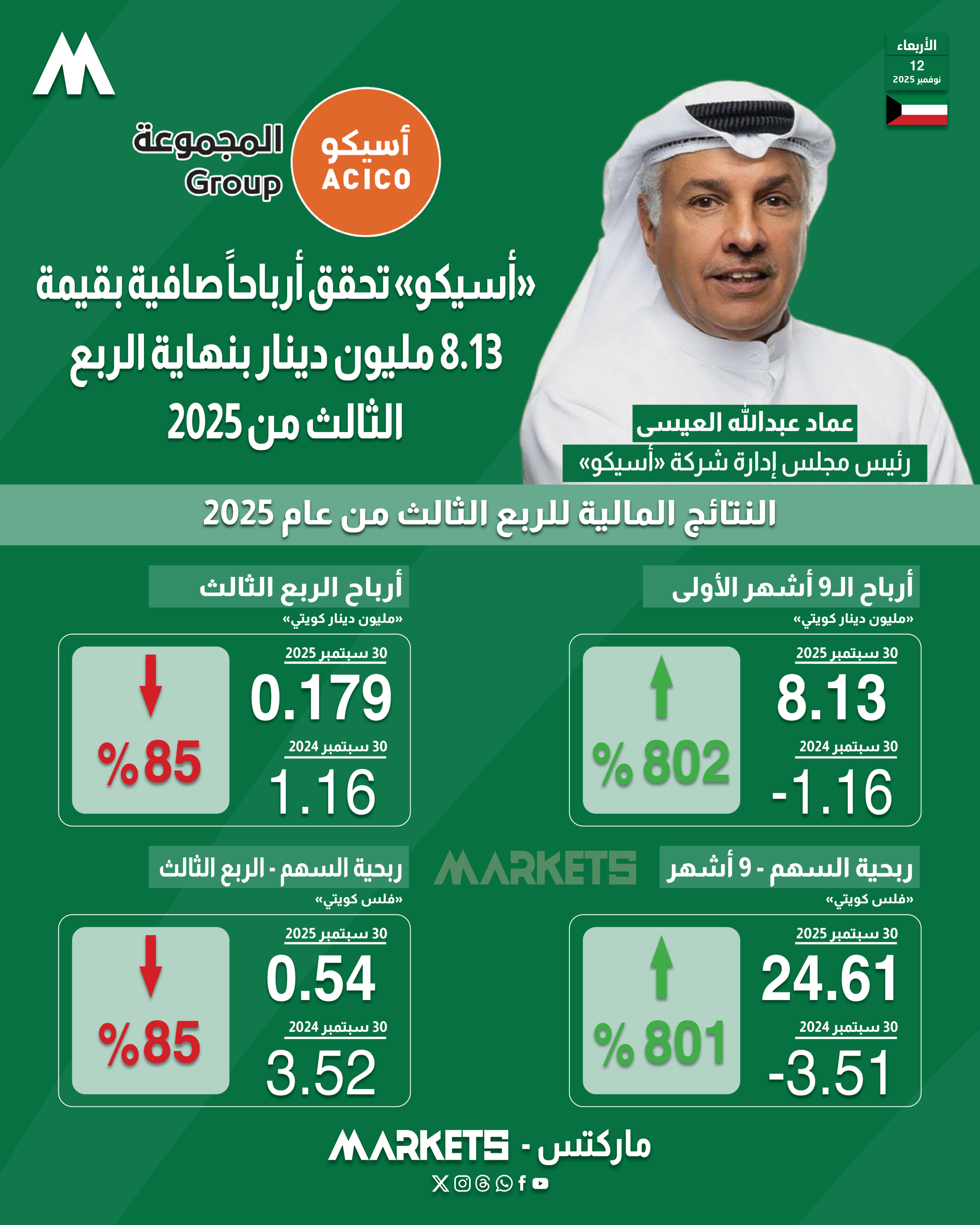 وخلال الربع الثالث من عام 2025 ، تراجعت أرباح «أسيكو» بنسبة 85% إلى 179.03 ألف دينار ، مقابل ربح قدره 1.16 مليون دينار خلال الربع الثالث من عام 2024 ، وبواقع 0.54 فلس للسهم .