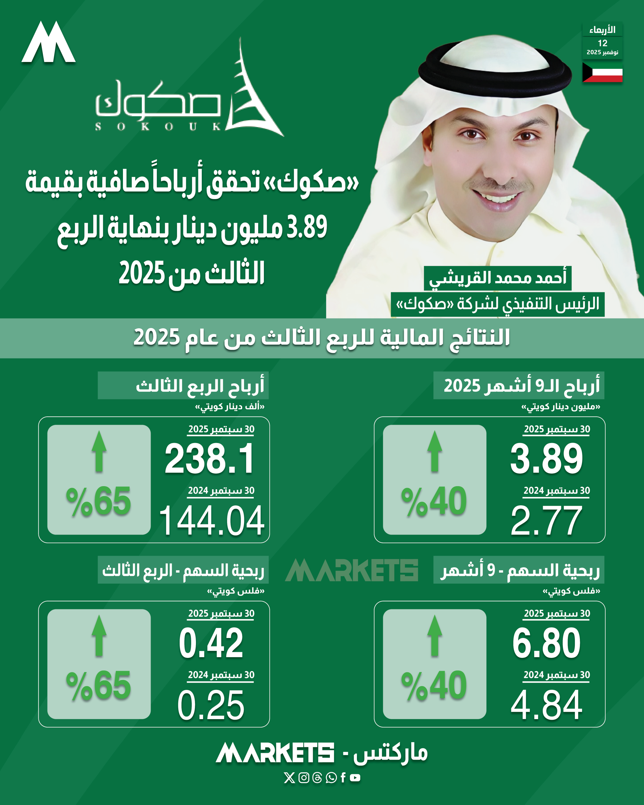 وخلال الربع الثالث من عام 2025 ، ارتفعت أرباح «صكوك» بنسبة 65% لتبلغ 238.1 ألف دينار ، مقابل 144.04 ألف دينار ربح الفترة ذاتها من عام 2024 ، وبواقع 0.42 فلس للسهم .