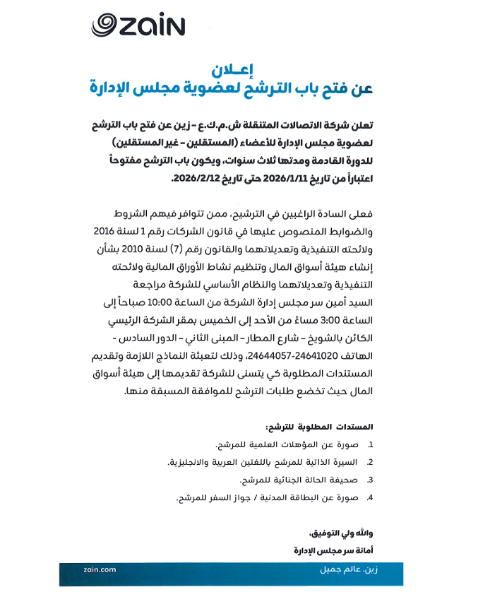 وأوضحت «زين» في إفصاح لبورصة الكويت اليوم الأربعاء أن باب الترشح سيكون مفتوحاً اعتباراً من تاريخ 2026/1/11 حتى تاريخ 2026/2/12.