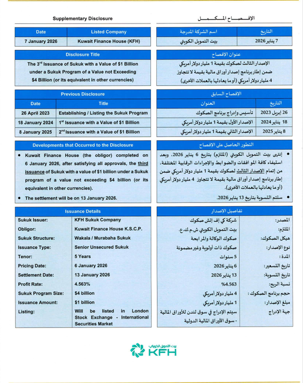 وأشار إلى أن المصدر شركة كي إف إتش صكوك ، ومدة الإصدار 5 سنوات ، وتاريخ التسعير 6 يناير 2026 ، بنسبة ربح 4.563% ، وسيتم الإدراج في بورصة لندن للأوراق المالية – سوق الأوراق المالية الدولية .
