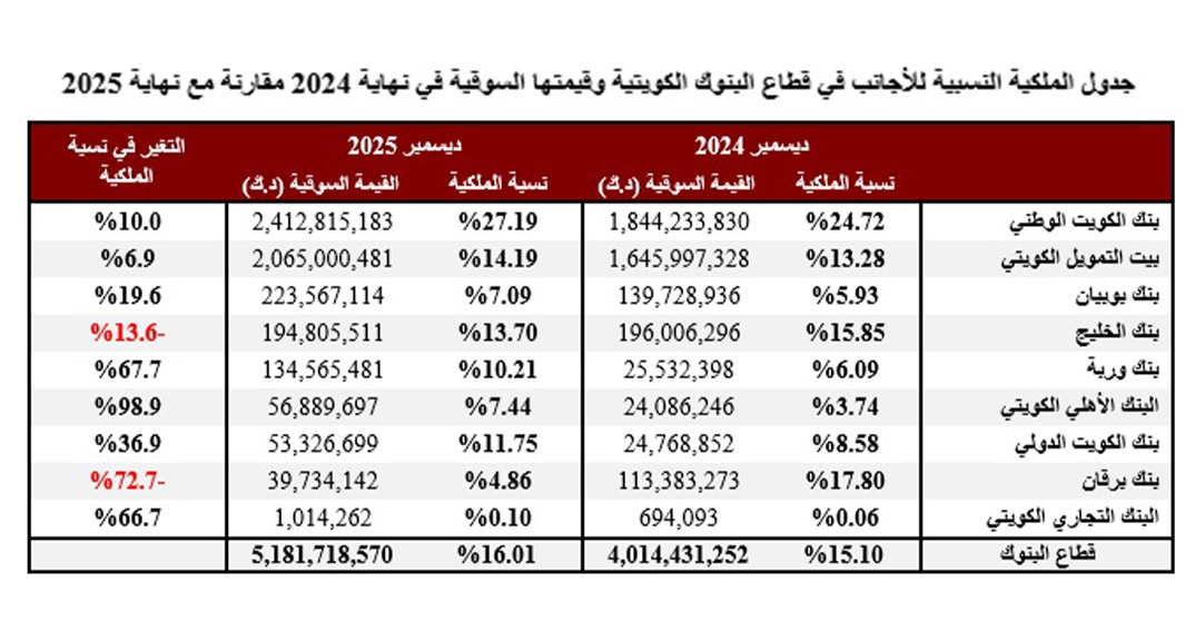 وذكر التقرير أن أعلى ارتفاع نسبي في الملكية خلال الفترة كان من نصيب البنك الأهلي الكويتي وبنحو 98.9 في المئة أو من نحو 3.74 في المئة في نهاية عام 2024 إلى نحو 7.44 في المئة ، وأعلى انخفاض نسبي في ملكية الأجانب كان من نصيب بنك برقان حيث انخفضت نسبة تملكهم بنحو 72.7 في المئة أي من نحو 17.80 في المئة إلى نحو 4.86 في المئة.