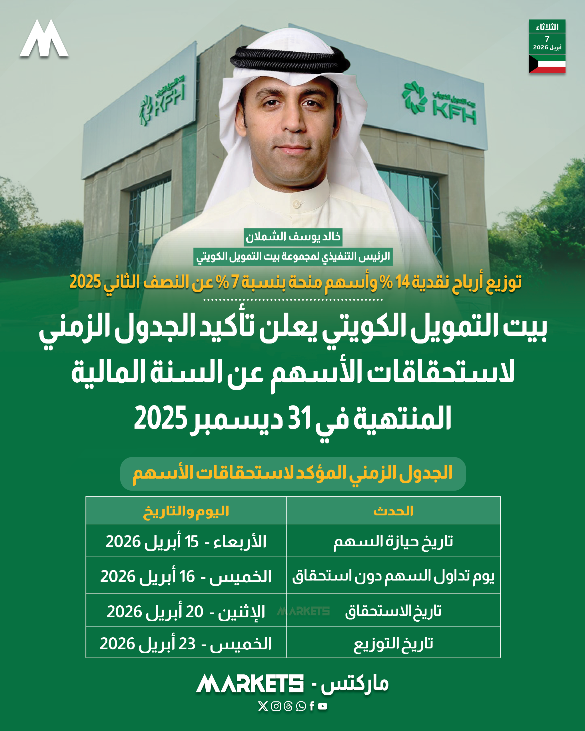 أعلن بيت التمويل الكويتي تأكيد الجدول الزمني لاستحقاقات الأسهم ، وذلك عن السنة المالية المنتهية في 31 ديسمبر 2025 .