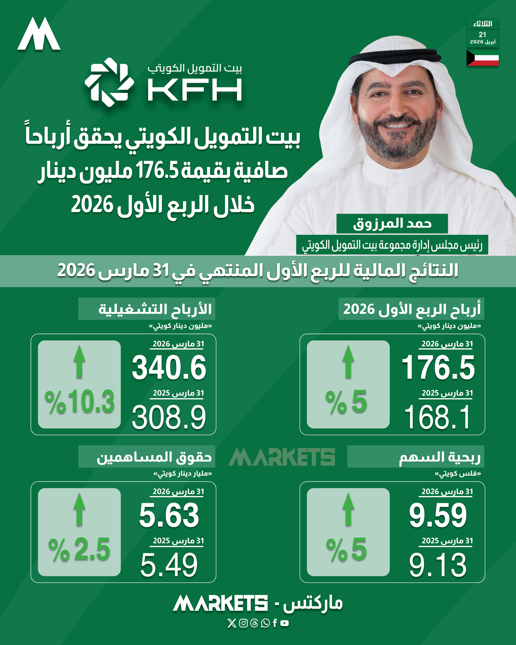 حقق بيت التمويل الكويتي أرباحاً صافية بقيمة بلغت 176.5 مليون دينار خلال الربع الأول من عام 2026 ، مقابل ربح قدره 168.11 مليون دينار خلال الربع الأول من عام 2025 ، بنمو سنوي 5% ، وبواقع 9.59 فلس للسهم الواحد .