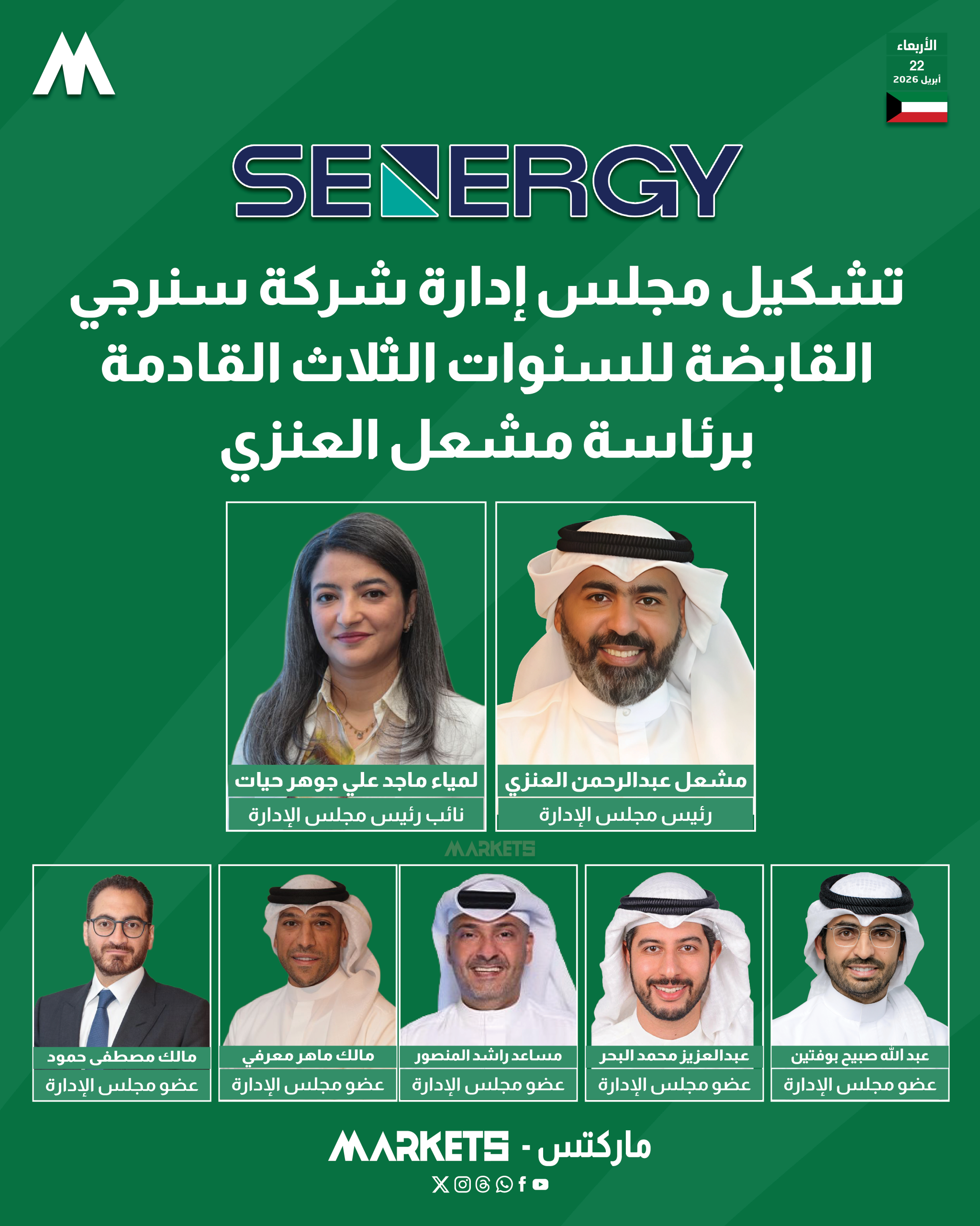 أعلنت شركة سنرجي القابضة تشكيل مجلس الإدارة للثلاث سنوات القادمة ، برئاسة مشعل عبدالرحمن العنزي ، وذلك بناءً على اجتماع الجمعية العمومية العادية للشركة بتاريخ 21 أبريل 2026 ، والتي تم من خلالها انتخاب مجلس إدارة جديد .