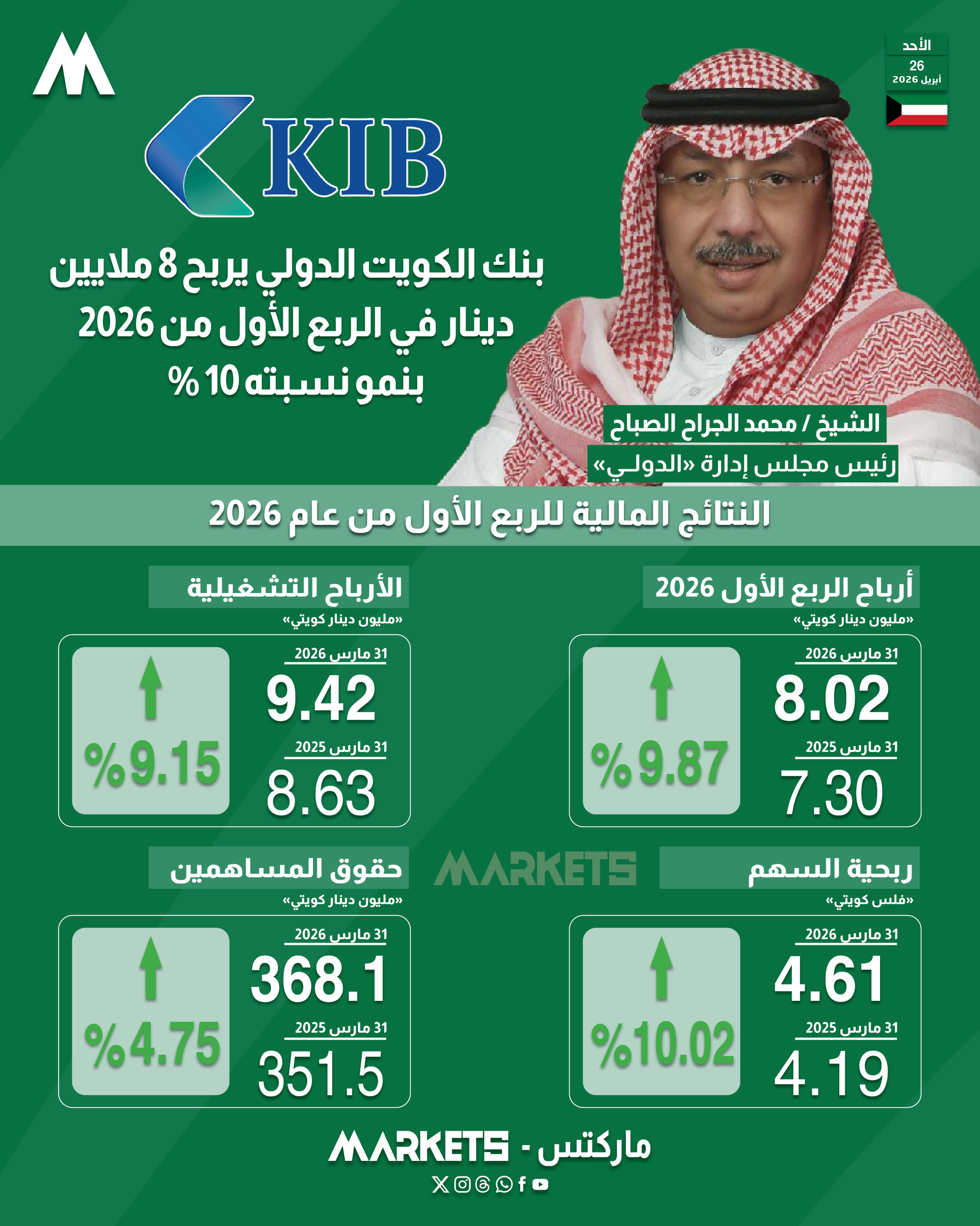 أعلن رئيس مجلس إدارة بنك الكويت الدولي (KIB) الشيخ محمد الجراح الصباح النتائج المالية للربع الأول من عام 2026، حيث حققت المجموعة صافي أرباح عائدة على المساهمين بنحو 8 ملايين دينار، وبربحية سهم بلغت 4.61 فلوس، مقارنة بأرباح بنحو 7.3 ملايين، وربحية سهم بلغت 4.19 فلوس خلال الربع الأول من عام 2025، وبنسبة نمو 10%، بينما بلغ إجمالي الإيرادات التشغيلية 24.5 مليوناً بنمو 13% مقارنة بالربع الأول من عام 2025.