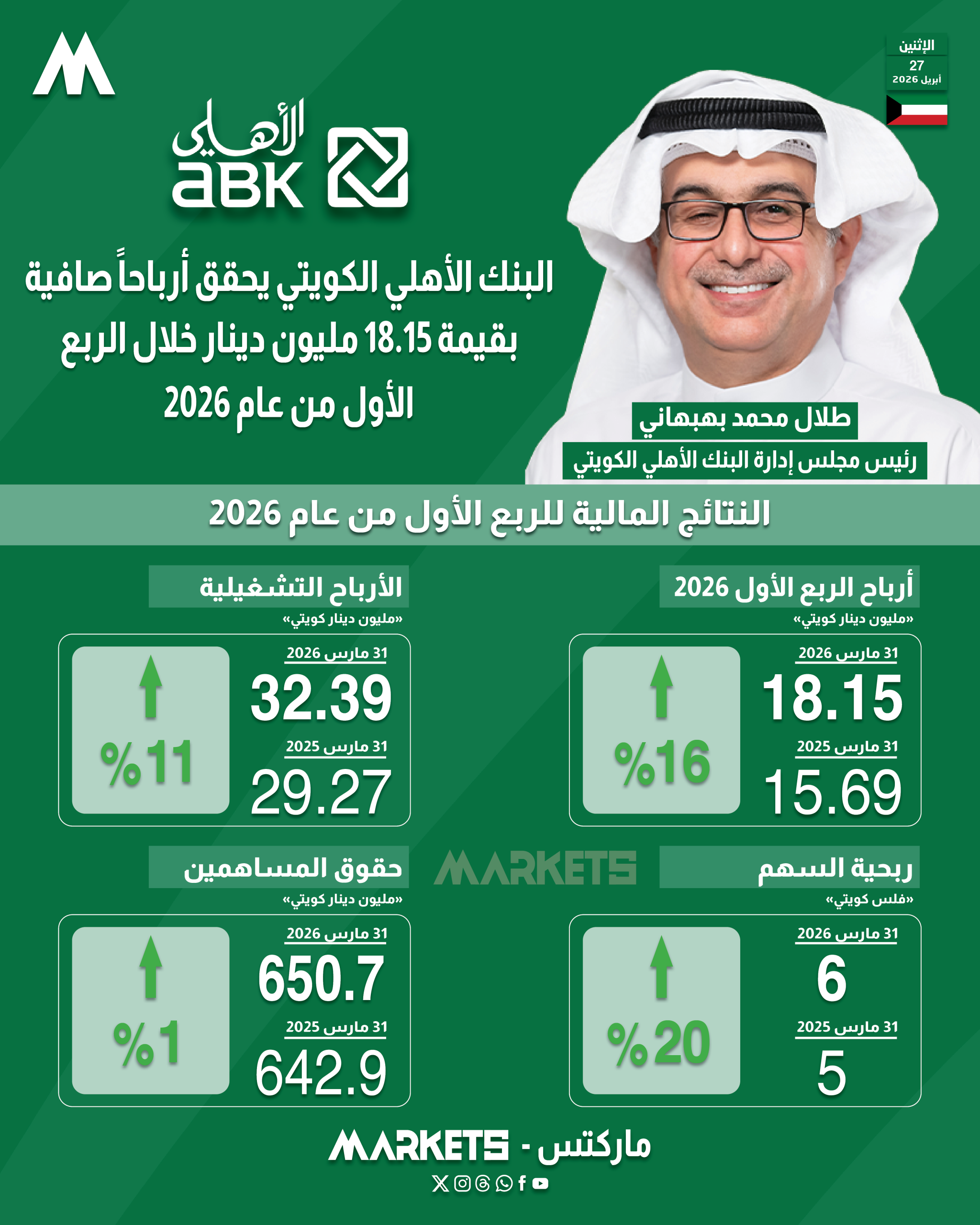 حقق البنك الأهلي الكويتي أرباحاً صافية بقيمة 18.15 مليون دينار خلال الربع الأول من عام 2026 ، مقابل ربح قدره 15.69 مليون دينار خلال الربع المماثل من عام 2025 ، بنمو 16% على أساس سنوي ، وبواقع 6 فلوس للسهم .